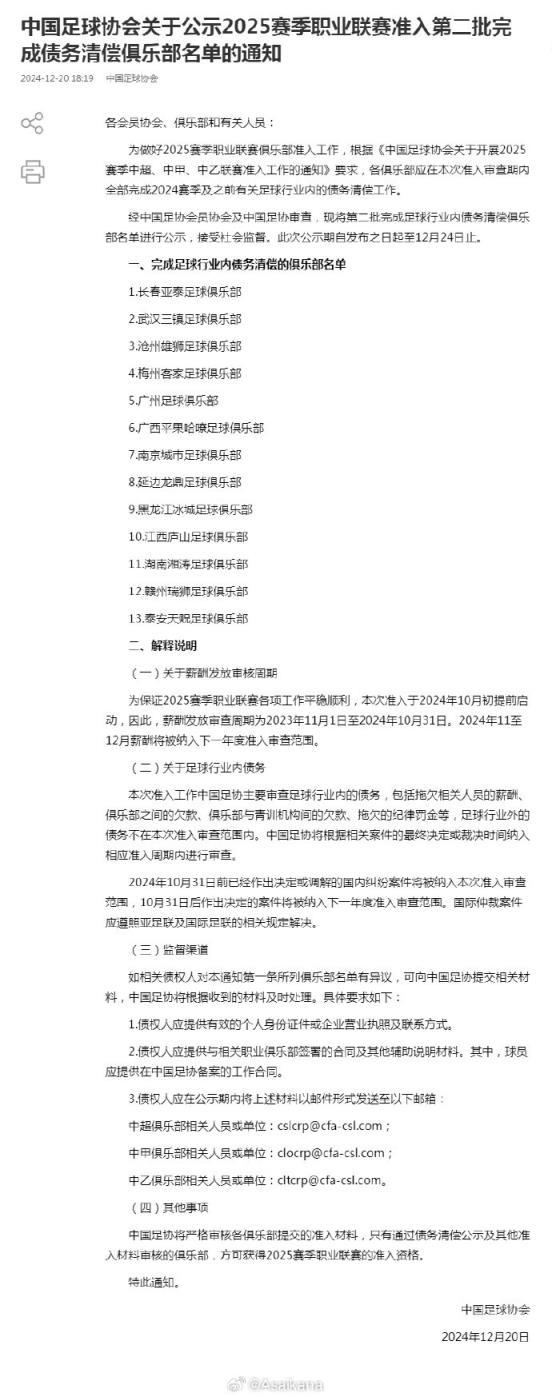 中國足協(xié)公示2025賽季職業(yè)聯賽準入第二批完成債務清償俱樂部名單,此前不在第一批名單里的長春亞泰、武漢三鎮(zhèn)、滄州雄獅、梅州客家、廣州、廣西平果哈嘹、南京城市、延邊龍鼎、黑龍江冰城、江西廬山、湖南湘濤、贛州瑞獅、泰安天貺全員上榜,相當于所有三級職業(yè)俱樂部都進行了完成債務清償的公示。 ???